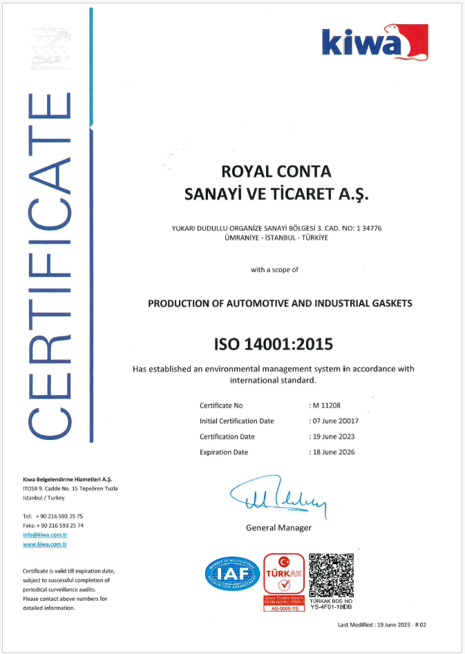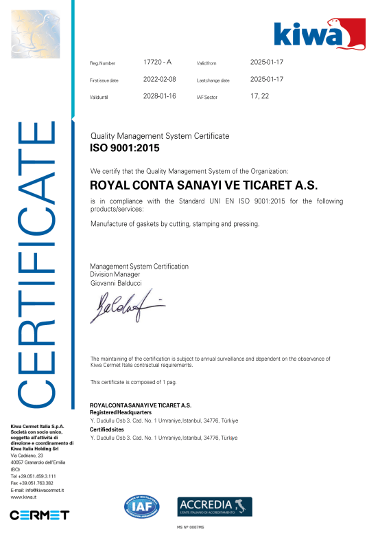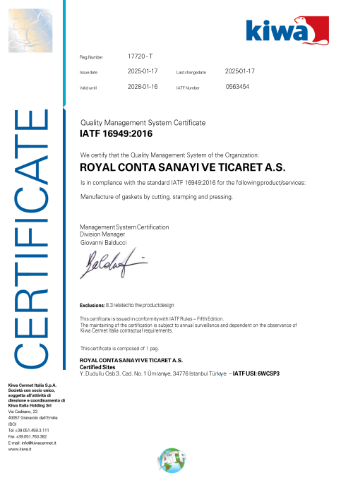 Bununla yetinmeyen Royal Conta, önce sadece otomotiv sektörüne yönelik olan QS 9000 kalite belgesini almış ve kalite sistemini sürekli geliştirerek IATF 16949 : 2016 kalite belgesine de sahip olmuştur. Hammaddenin girişinden başlayarak yarı mamul ve nihai ürüne gelene kadar ki tüm imalat aşamalarında kontrol uygulanmasının yanı sıra, kestirimci ve önleyici bakımla beraber R&R ve SPC metotları kullanılarak ve sürekli iyileştirmelerle TQM firma kültürüne yerleşmiştir.